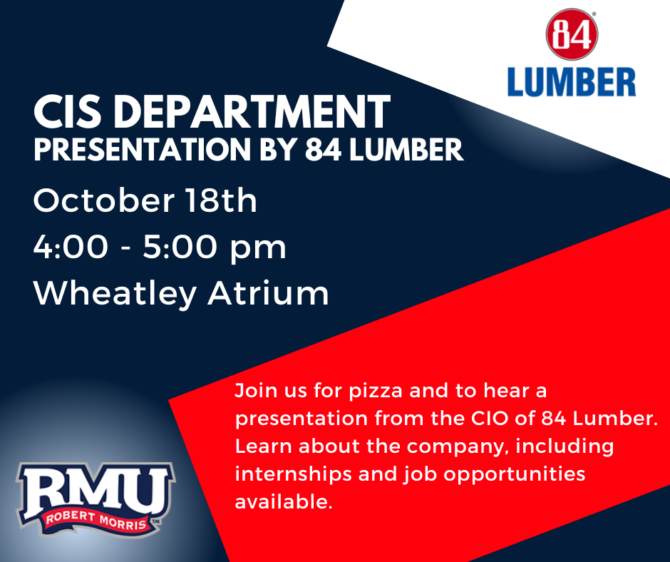 On October 18th, please join us in the Wheatley atrium for a presentation from the CIO of 84 Lumber. Students interested in internships and job opportunities should definitely attend.