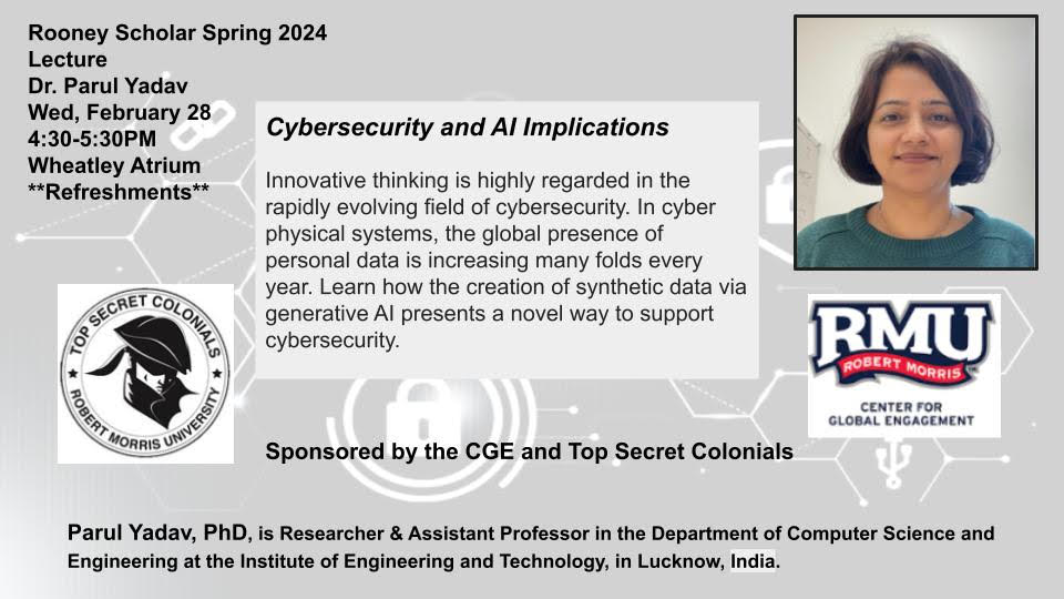 Dr. Parul Yadav to present on Cybersecurity and AI Implications Leave a reply Dr. Parul Yadav, RMU’s Spring 2024 Rooney Scholar, will be presenting on Cybersecurity and AI Implications in the Wheatley Atrium on Wednesday, February 28th from 4:30-5:30pm. Students will receive 1 hour of SET credit. Pizza will be served. Share this:Tweet Click to email a link to a friend (Opens in new window) Email Related