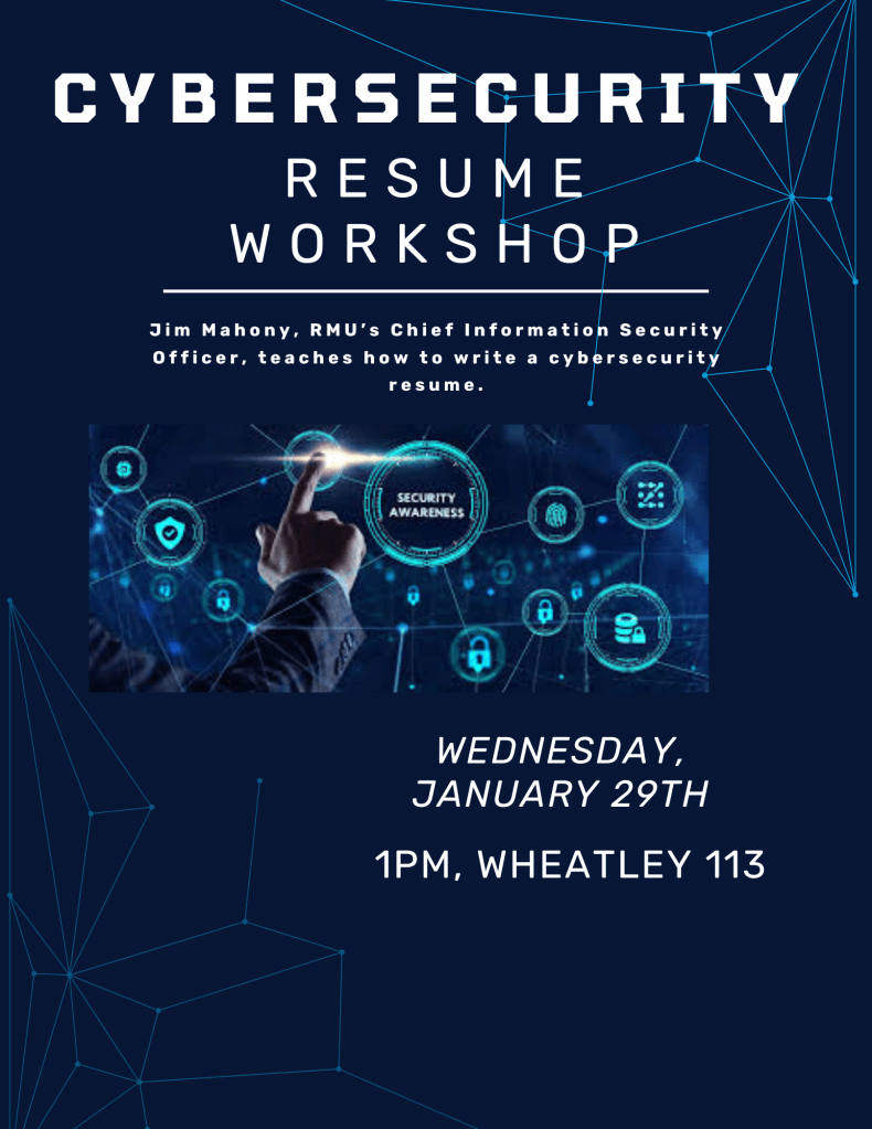 Students interested in learning how to build their professional network and write a cybersecurity resume are invited to join RMU’s Chief Information Security Officer, Jim Mahony, on Wednesday, January 29th at 1:00pm in Wheatley 113.