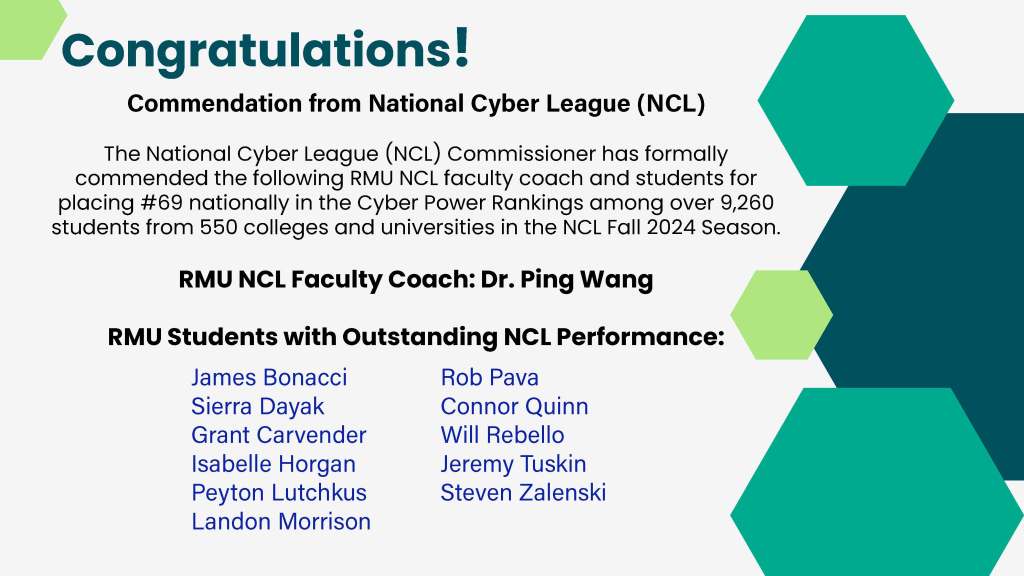 The National Cyber League (NCL) Commissioner has formally commended the following RMU NCL faculty coach and students for placing #69 nationally in the Cyber Power Rankings among over 9,260 students from 550 colleges and universities in the NCL Fall 2024 Season.