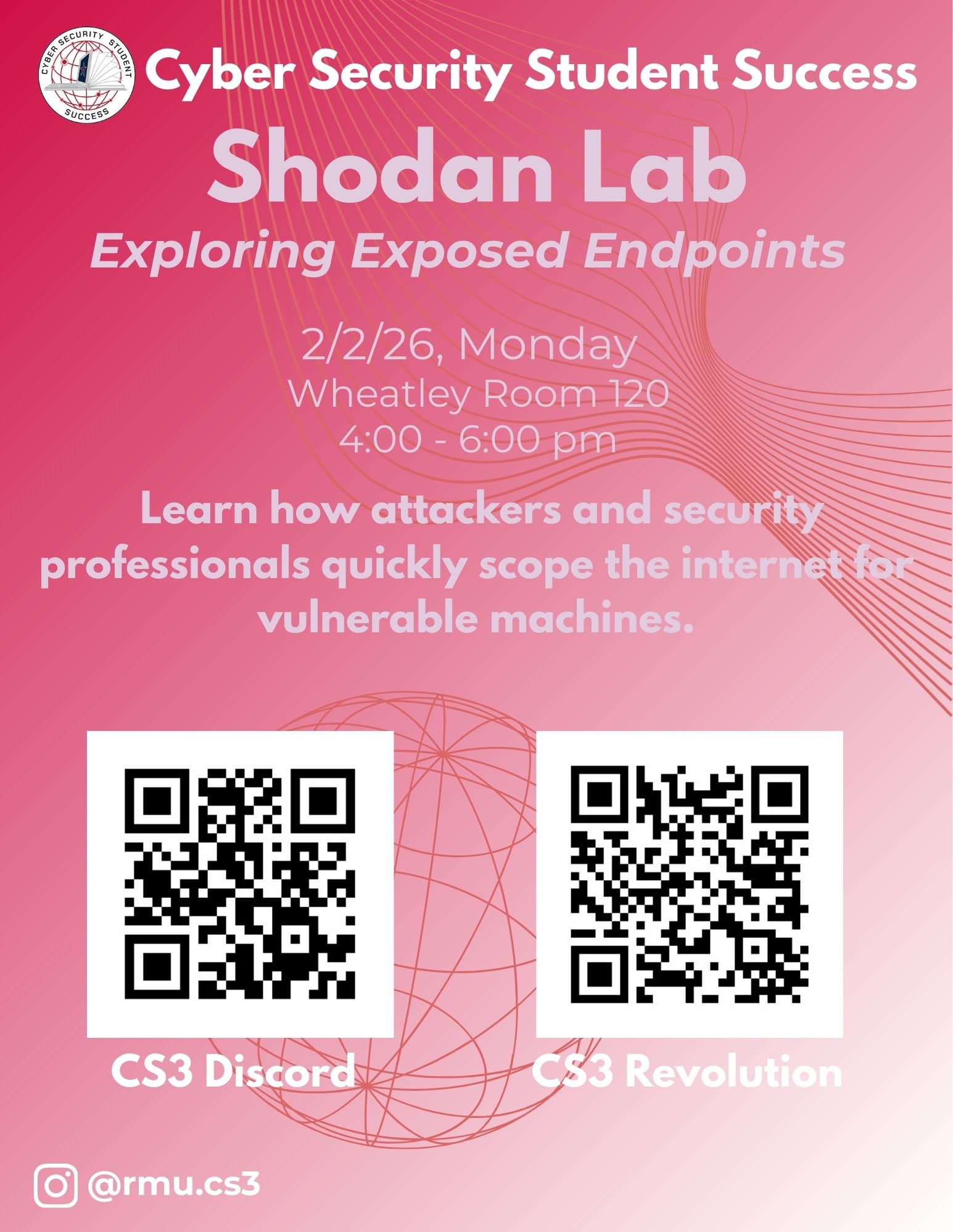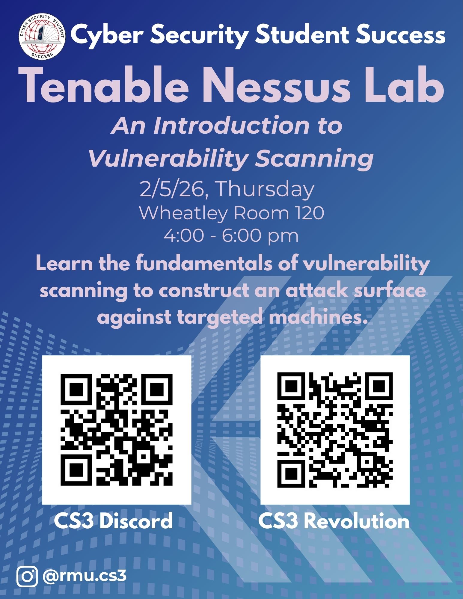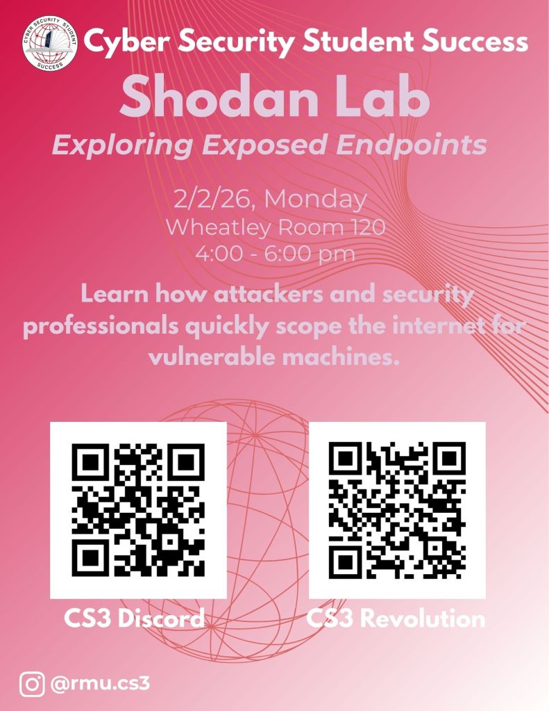 Join CS3 on February 2nd and February 5th from 4:00pm – 6:00pm for their first two labs: “Shodan – Exploiting Exposed Endpoints” and “Tenable Nessus – An Introduction to Vulnerability Scanning”.