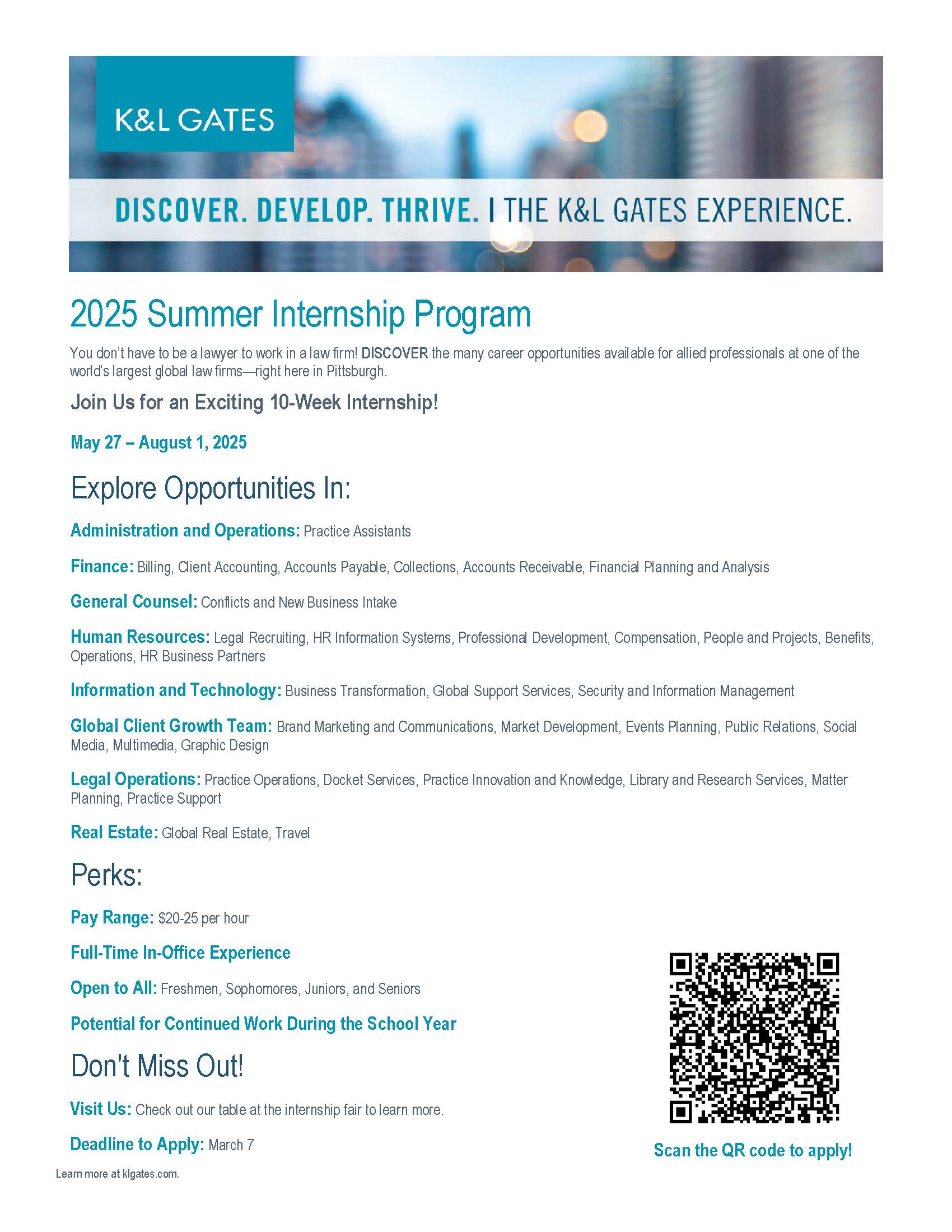 K&L Gates are seeking Business students from all disciplines, mainly, Information Technology, Public Relations and those interested in the legal field.